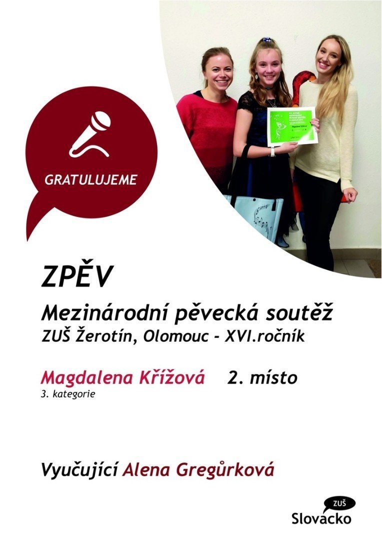Velký úspěch Magdalenky Křížové, která vyhrála 2. místo Mezinárodní pěvecké soutěže ZUŠ Žerotín v Olomouci g r a t u l u j e m e Magdalence i její učitelce Alči Gregůrkové.
