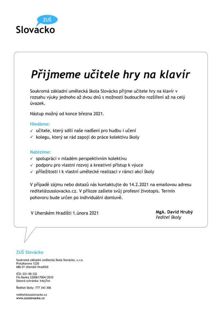 reditel@zusslovacko.cz. V příloze zašlete svůj profesní životopis. Termín pohovoru bude určen po individuální domluvě.