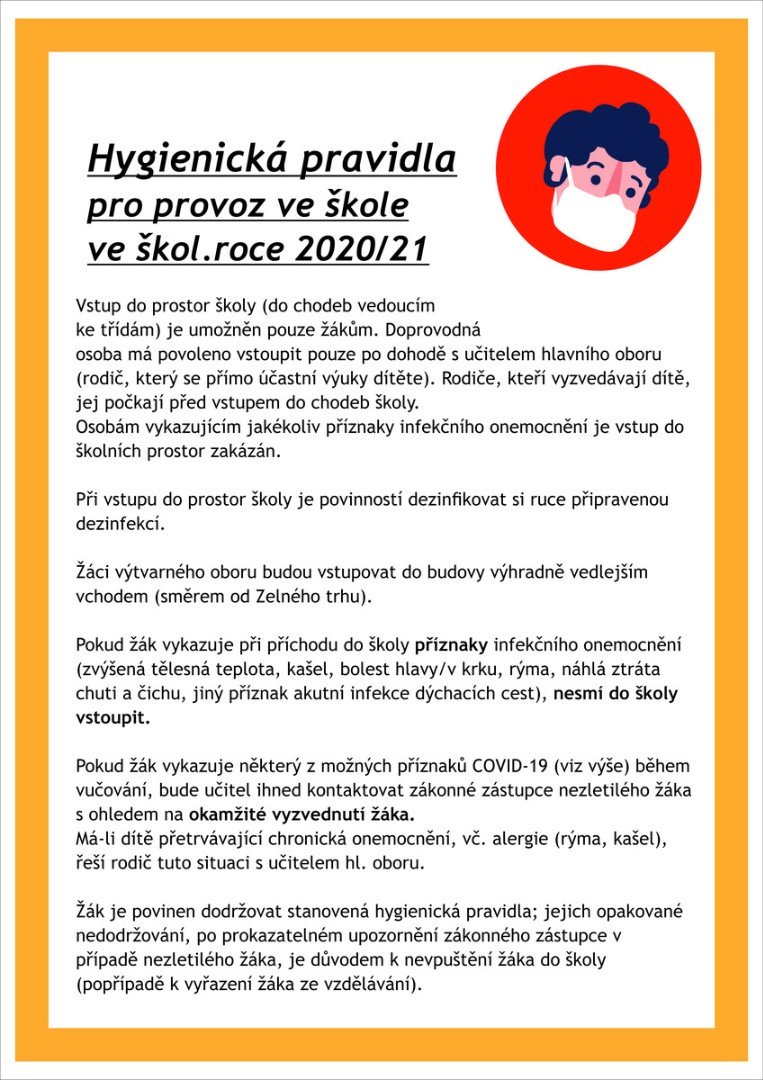 - Osobám vykazujícím jakékoliv příznaky infekčního onemocnění dýchacích cest, je vstup do školy ZAKÁZÁN.