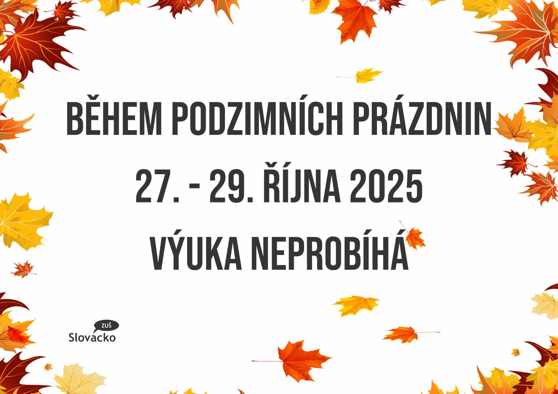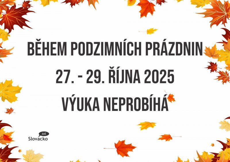 Během podzimních prázdnin v době od 27. do 29. října 2025 nebude v ZUŠ Slovácko probíhat výuka.