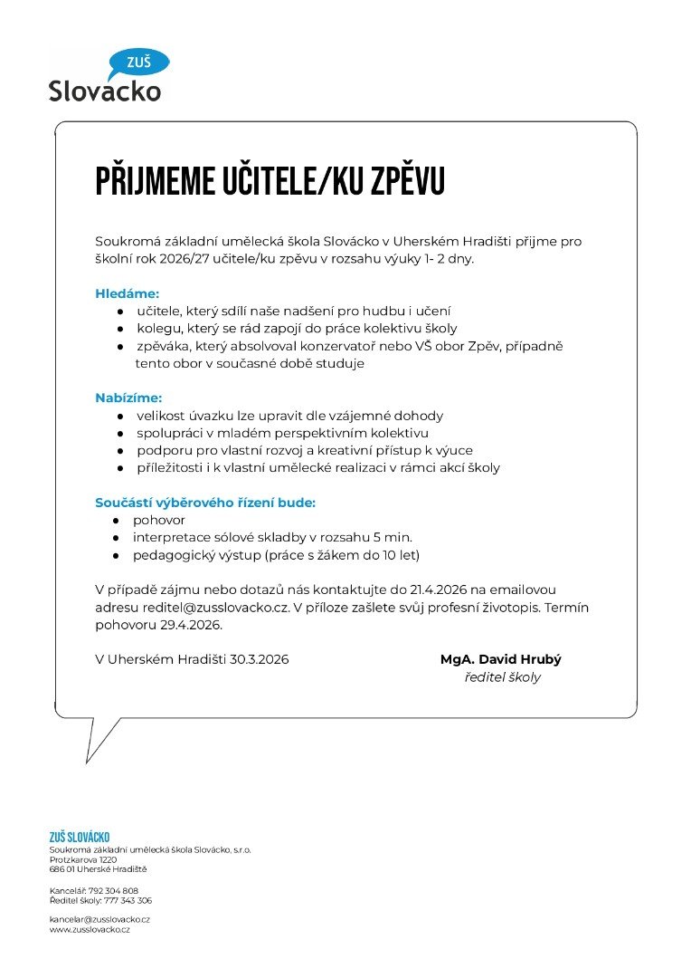 Soukromá základní umělecká škola Slovácko v Uherském Hradišti přijme pro školní rok 2026/27 učitele/ku zpěvu v rozsahu výuky 1- 2 dny.
