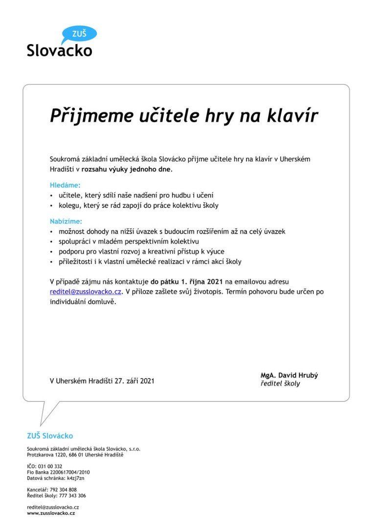 V případě zájmu nás kontaktuje do pátku 1. října 2021 na emailovou adresu reditel@zusslovacko.cz. V příloze zašlete svůj životopis. Termín pohovoru bude určen po individuální domluvě.