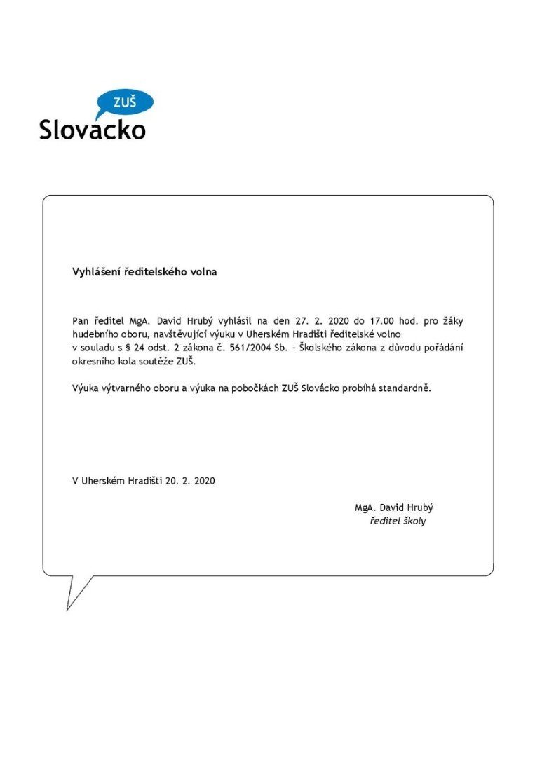Pan ředitel MgA. David Hrubý vyhlásil na den 27. 2. 2020 do 17.00 hod. pro žáky hudebního oboru, navštěvující výuku v Uherském Hradišti ředitelské volno. Budeme pořádat okresní kolo soutěže ZUŠ ve hře na kytaru.